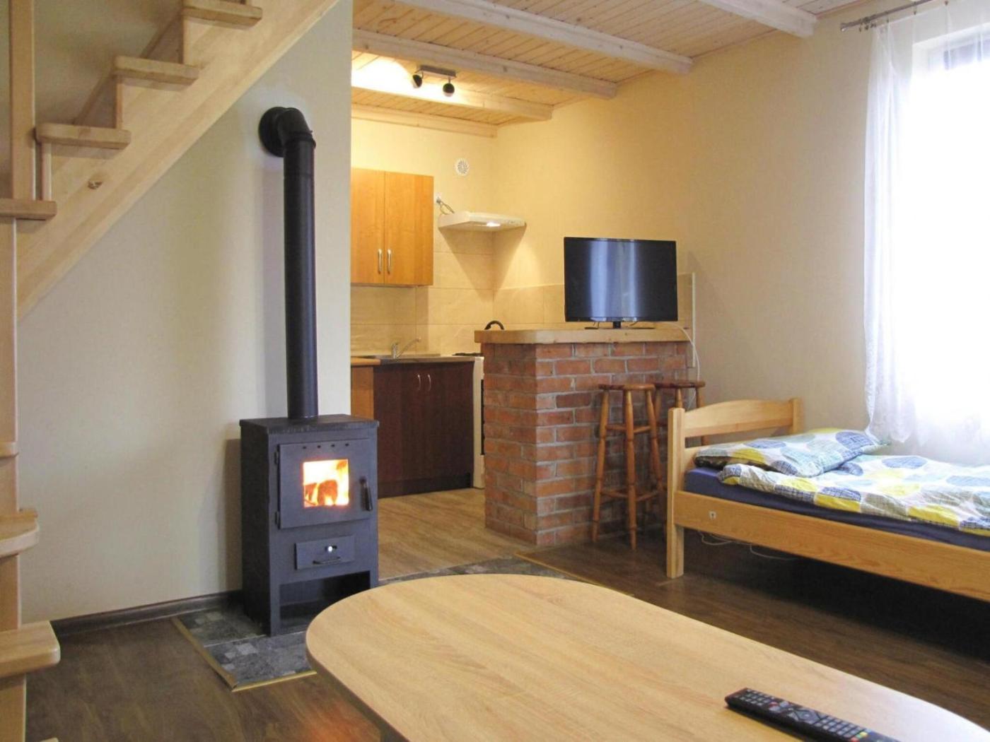 Dom wakacyjny z 2 sypialniami. The fireplace is a top feature of this holiday home. This holiday home comes with 1 living room, 2 separate bedrooms and 2 bathrooms with a shower. Guests will find a stovetop, a refrigerator and an oven in the kitchen. The holiday home also includes a barbecue. Boasting a terrace with lake views, this holiday home also features a tea and coffee maker and a TV. The unit has 6 beds. Dom wakacyjny - 5 osobowy. Powierzchnia pokoju ok.: 70 mkw.