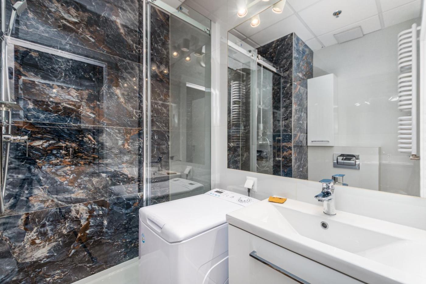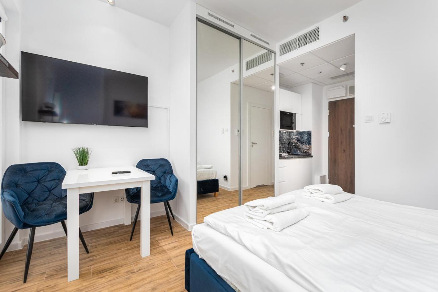 Studio. In the fully equipped kitchenette, guests will find a stovetop, a refrigerator, a dishwasher and kitchenware. The studio offers air conditioning, a washing machine, a balcony with city views as well as a private bathroom boasting a shower. The unit has 1 bed. Studio - 2 osobowy. Powierzchnia pokoju ok.: 19 mkw. ;